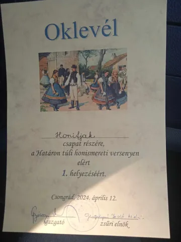 Április 12-én Csongrádon rendezték több csapat részvétele mellett a Határon túli honismereti versenyt, ahol iskolánk "Honifjak csapata" az I. helyen végzett.