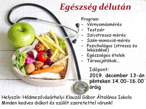 Szeretettel várunk mindenkit 2019. december 13-án (pénteken) 14:00-16:00 óráig tartandó Egészség délutánunkra!